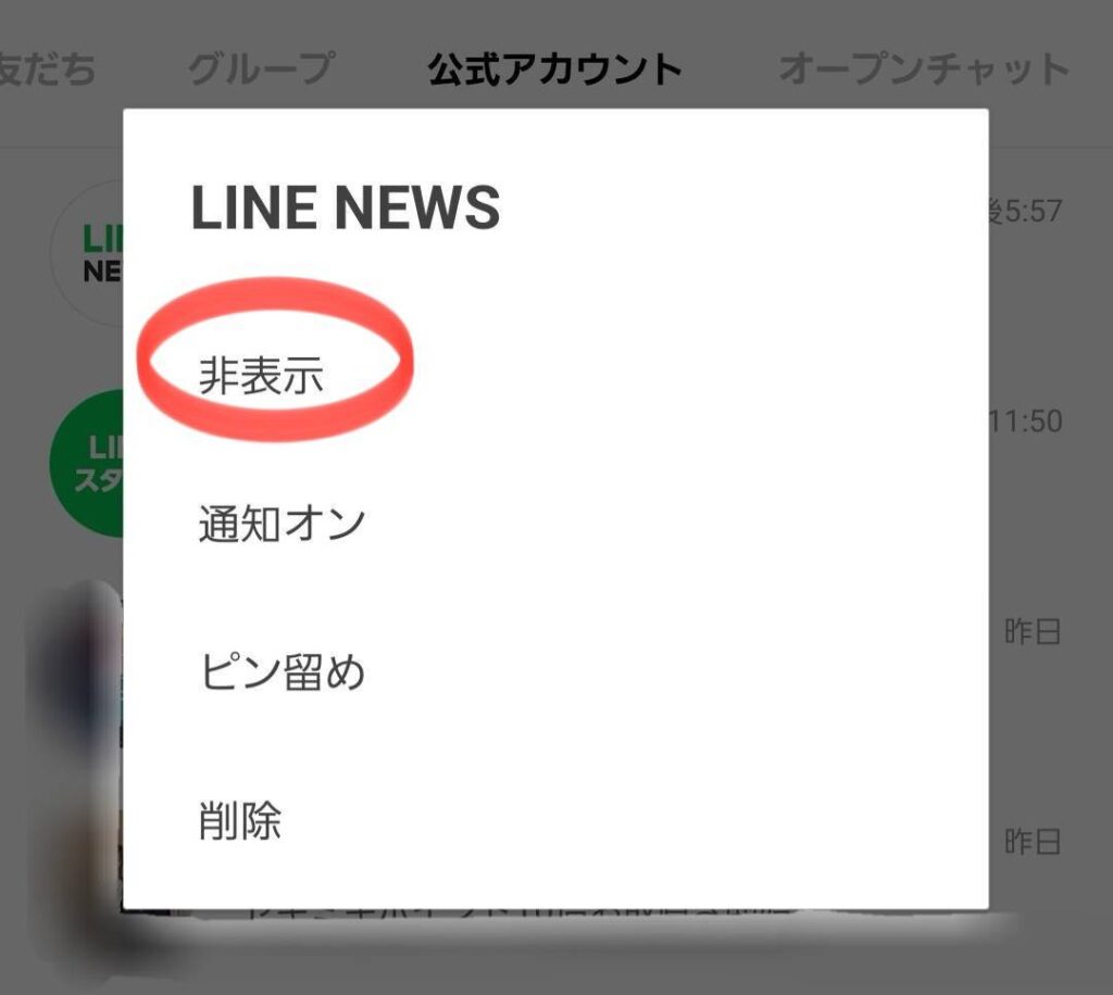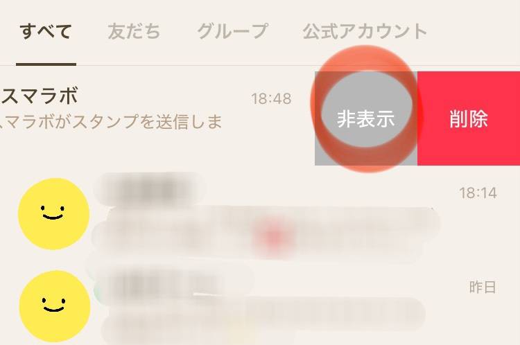 トーク一覧 → 右にスワイプ → 非表示